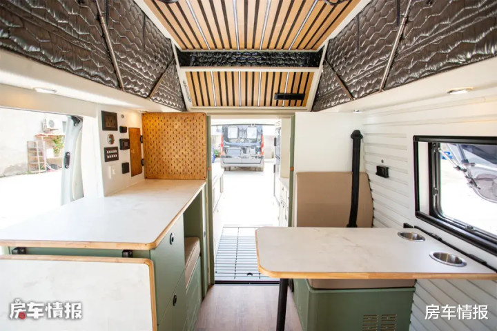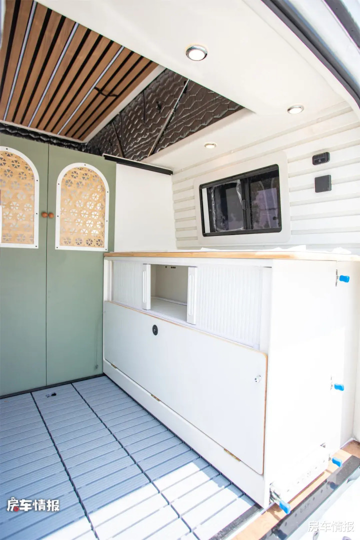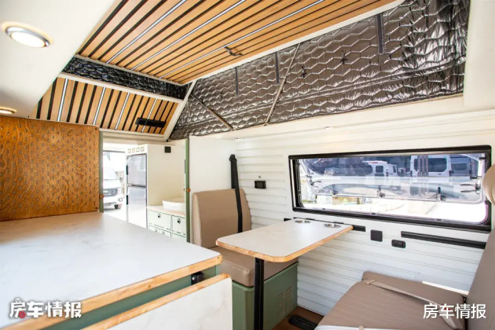 车顶部分采用电动升降设计,相比传统短轴底盘车型,升降顶尺寸进一步扩大,使车内床铺尺寸达到了2.4米×1.3米,轻松容纳两位成人休息。有人可能会担心切割车顶会影响结构强度,请放心——改造仅涉及外层装饰性铁皮,未触碰车身结构件,而新装车顶的强度甚至优于原厂。