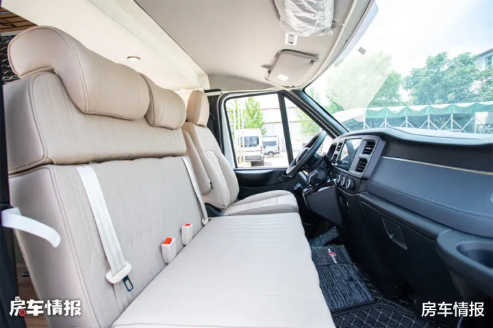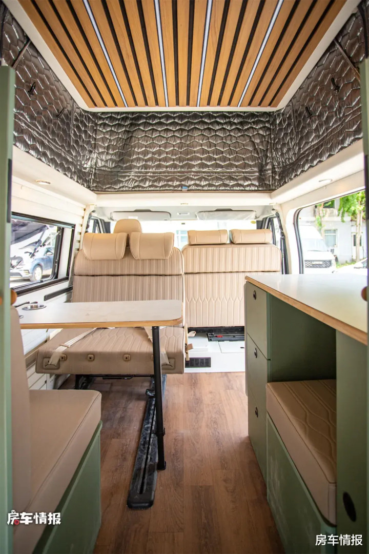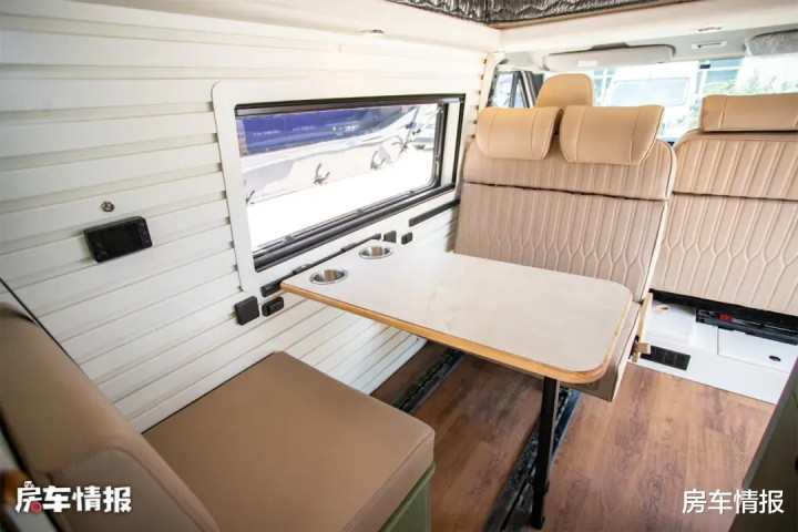 乘坐区设计极具弹性。常规状态下为四人对卡座布局,也可将座椅前翻转为正向乘坐,餐桌同时前移,适应不同场景。甚至可将座椅靠背与坐垫完全折叠竖立,腾出大块空间存放行李。