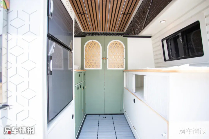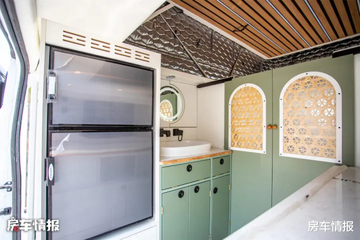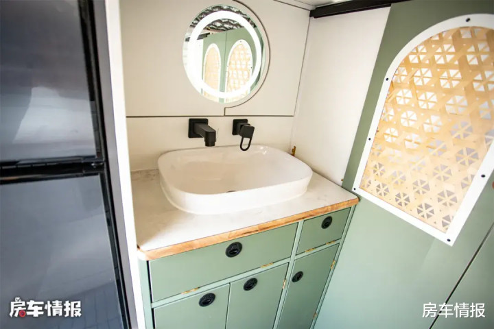 车尾区域强调厨房与洗漱功能,卫生间则适当简化。后方与生活区通过两扇推拉门隔开,虽不能完全隔绝气味,但有效保障隐私与视觉整洁。左侧洗漱台配备大容量洗手池和带储物功能的梳妆镜,贴心照顾女性用户需求。