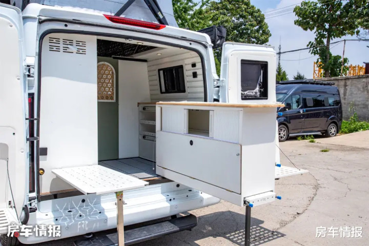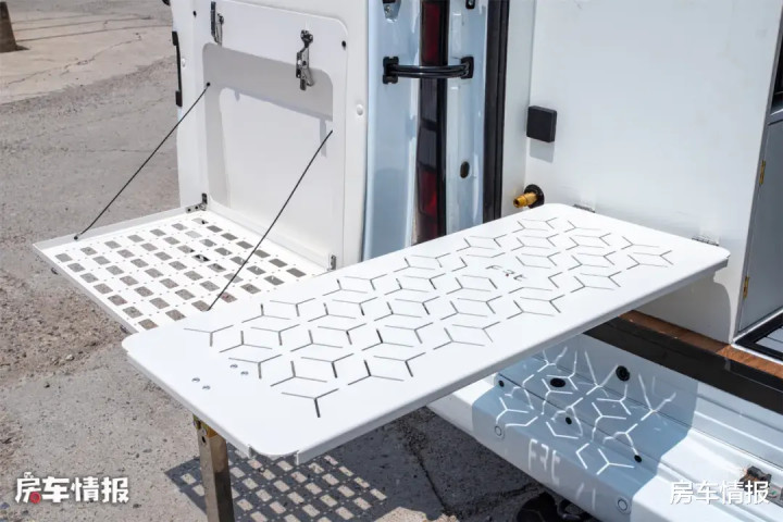 右侧厨房为内外两用设计:橱柜可整体外抽,内侧预留储物格,上层存放调料餐具,下层作为操作台,可摆放电磁炉或卡式炉。车尾门还设有轻量化铝制翻折板与折叠餐桌,美观与实用兼得。