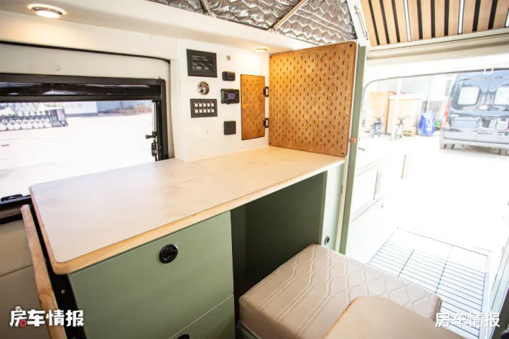 走进车内,扑面而来的是当下流行的Vanlife风格。原木色车顶与浅色内饰相得益彰,后隔断门的编织纹理小窗进一步渲染出露营氛围。整体布局创新大胆,功能够用且不失格调。